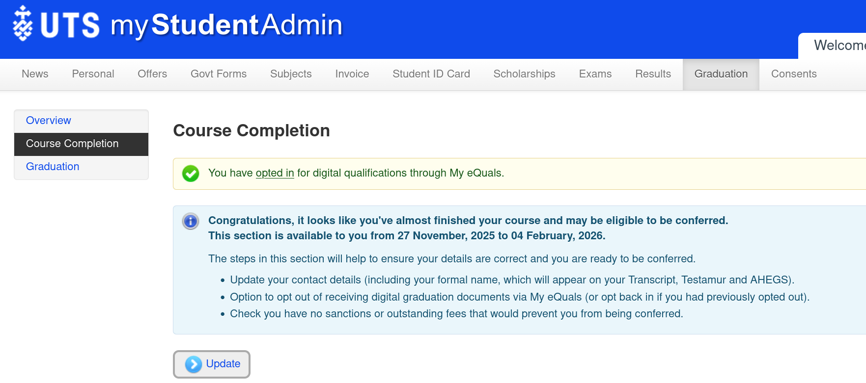 The process to do this is officially known as a "Course Transfer - Graduation" or a "Course Transfer to Graduate". You can read up about this process here. However, the official UTS documents are rather vague, so this is what this guide is for.