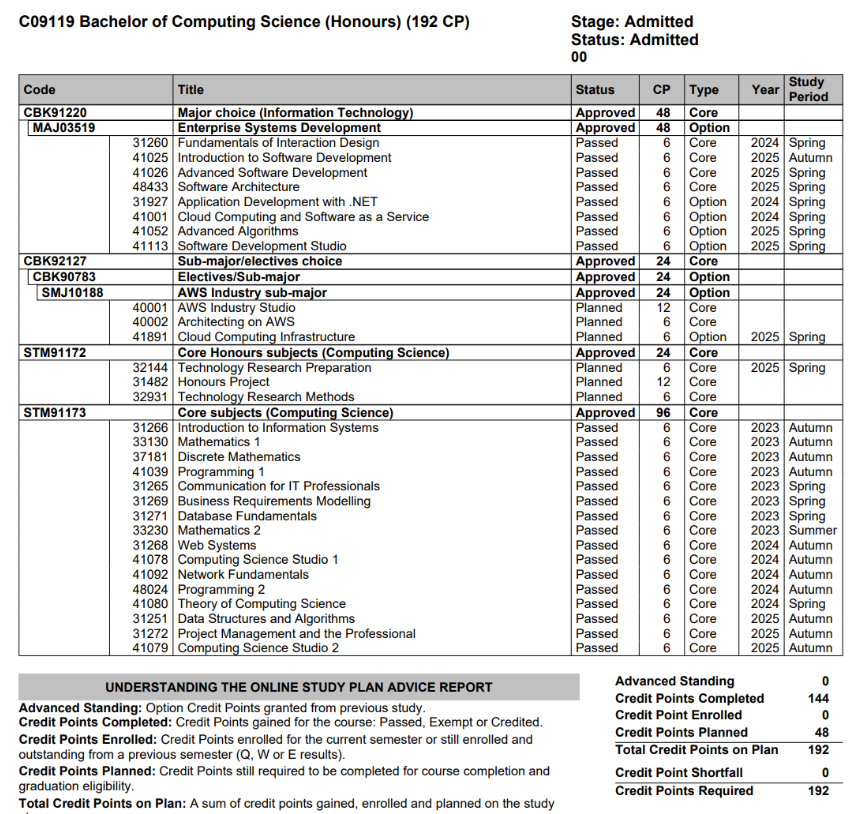 This guide has been written in 2026, by a CompSci student starting her honours-embedded degree in 2023. Hence, the version of the course I started with was C09119v2 and the version of the course I graduated with is C10476v3. This guide may or may not be updated in the future, hence please check the UTS Course Handbook for what versions of C09119 and C10476 apply to you. Furthermore, I majored in Enterprise Systems Development Major, so my guide only serves as an example for what subjects to choose. The major you have chosen may require additional research for the transfer process.