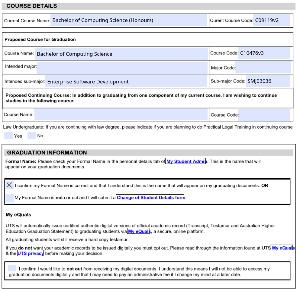 I had heard from one of the members of the programming society (Oli) that he had successfully transfered from the 4 year Honours course for Computing Science (C09119v2) to a non-honours 3 year degree (C10476v2). After hearing about this, I figured that I would like to also attempt to do the same. Given that this is my 3rd year at UTS, I would like to make it my last undergraduate year if possible.