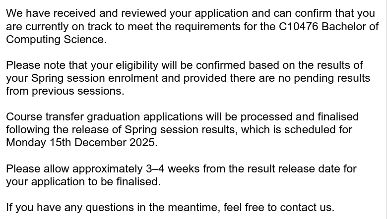 Afterwards, in about a months time after the result release date for your last semester, if you have passed all your subjects for the semester you will be given an email like such:
